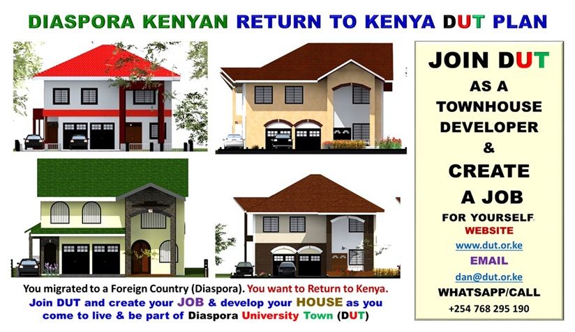 Diaspora Kenyans are a result of jobs created abroad. Diaspora University Town (DUT) is a job-creation project. The project is on track to achieve 20,000 new jobs. 2,000 jobs are reserved for Diaspora Kenyans who wish to return to Kenya. Just as jobs created abroad feed, clothe, house, and meet the needs of those who go abroad, the jobs at DUT will do the same. A Diaspora Kenyan considering relocating to Kenya can apply for a DUT job by joining DUT.