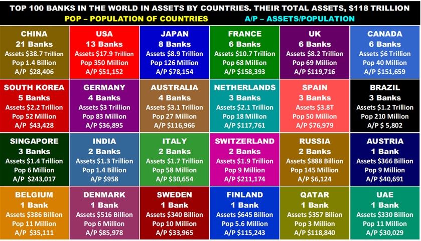 The top 100 banks in the world hold $118 trillion in bank assets. The 100 banks are in 24 countries of the 195 countries in the world. 21 banks are in China and hold a total of $39 trillion in assets. 13 banks are in the USA with assets totaling $18 trillion. 8 banks are in Japan holding assets of $10 trillion. France, Canada, and the U.K. have 6 banks each with total assets of $10.7 trillion, $10 trillion, and $6 trillion, respectively.